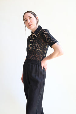 Short sleeve polo cut in an open work floral lace. Pointed collar and pearlescent snap closure. Contrast stitching at edges. Adds a bit of romance to the everyday.